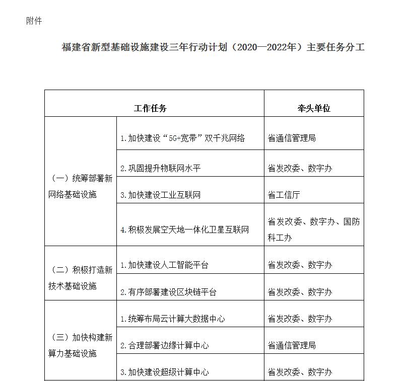 附件:福建省新型基础设施建设三年行动计划(2020—2022年)主要任务分工